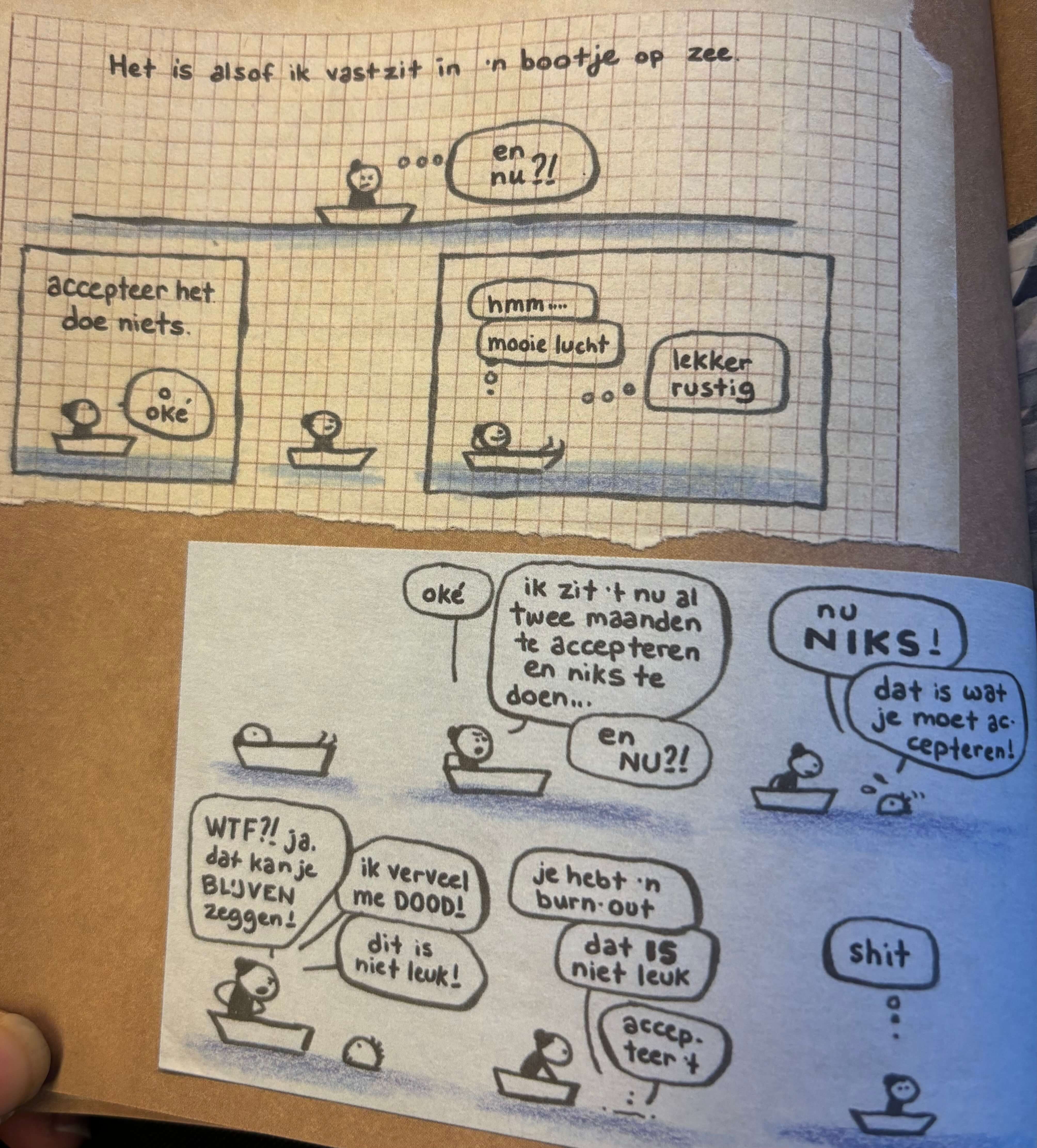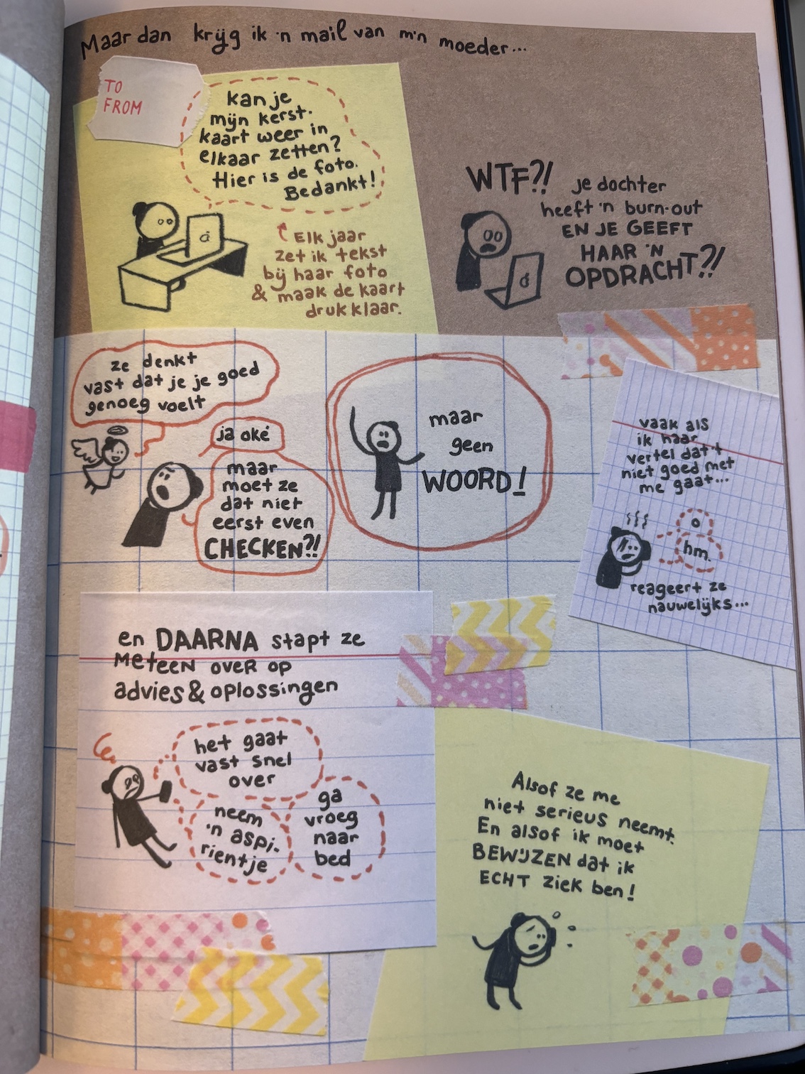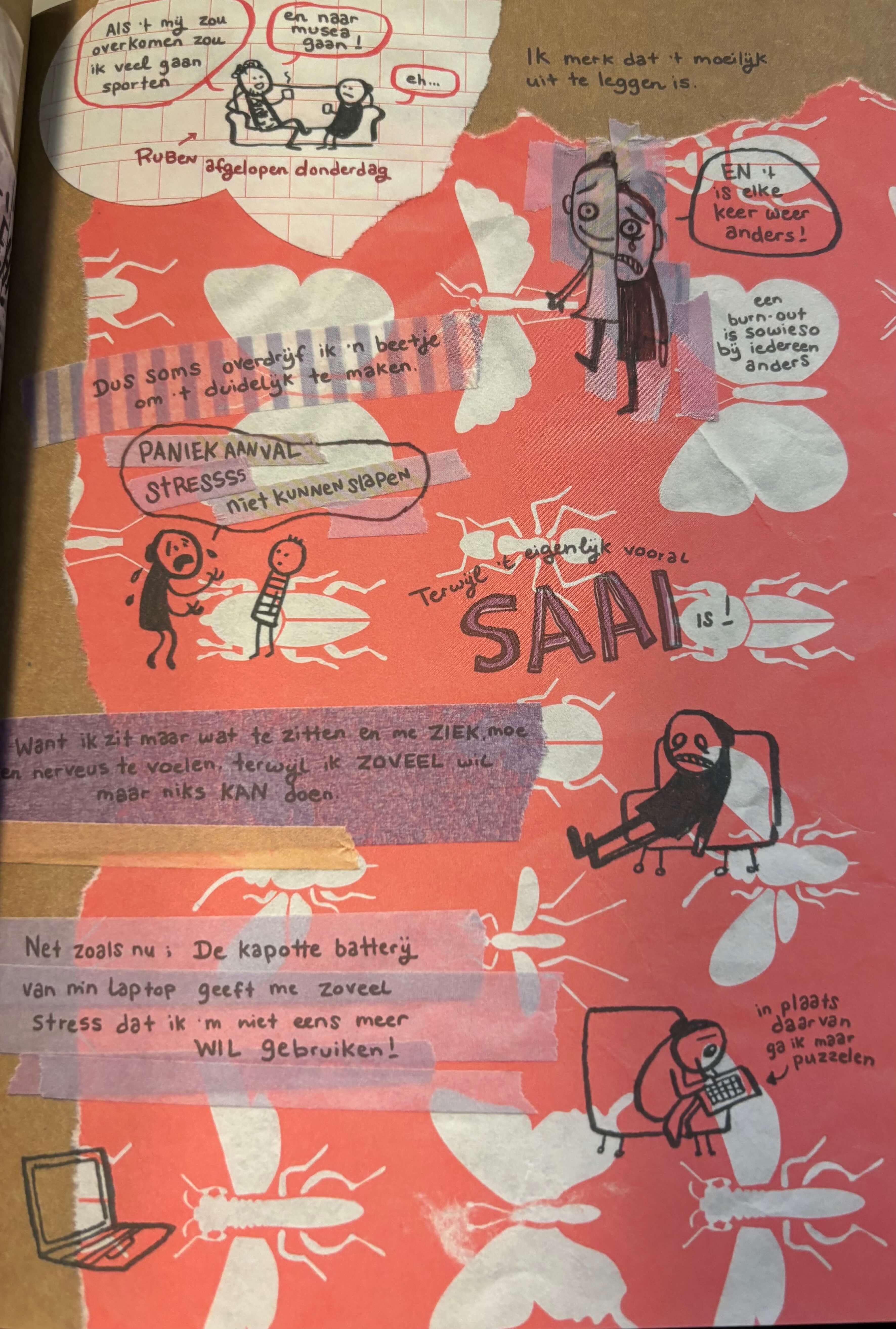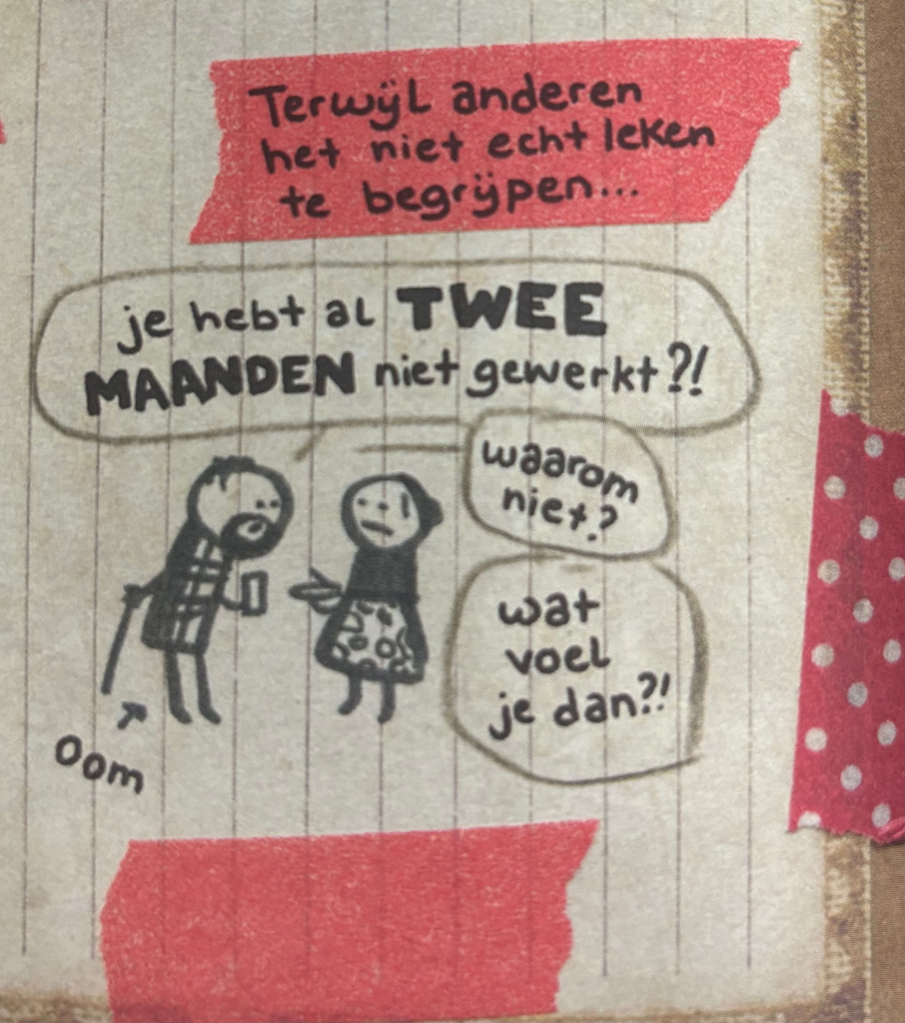 Maaike illustreert hier goed hoe het is om midden in die burn-out te zitten. Ik denk dat het belangrijk is om te laten zien dat niemand vrijwillig zich zo voelt, en dat het ook geen pretje is om een burn-out te hebben. Ik vind het ook mooi hoe Maaike laat zien dat je zelf bewuster raakt van dat je een probleem hebt, en dat dat probleem nog niet is opgelost en dat je niet altijd op dat moment een oplossing er voor hebt. Het is een heel proces.