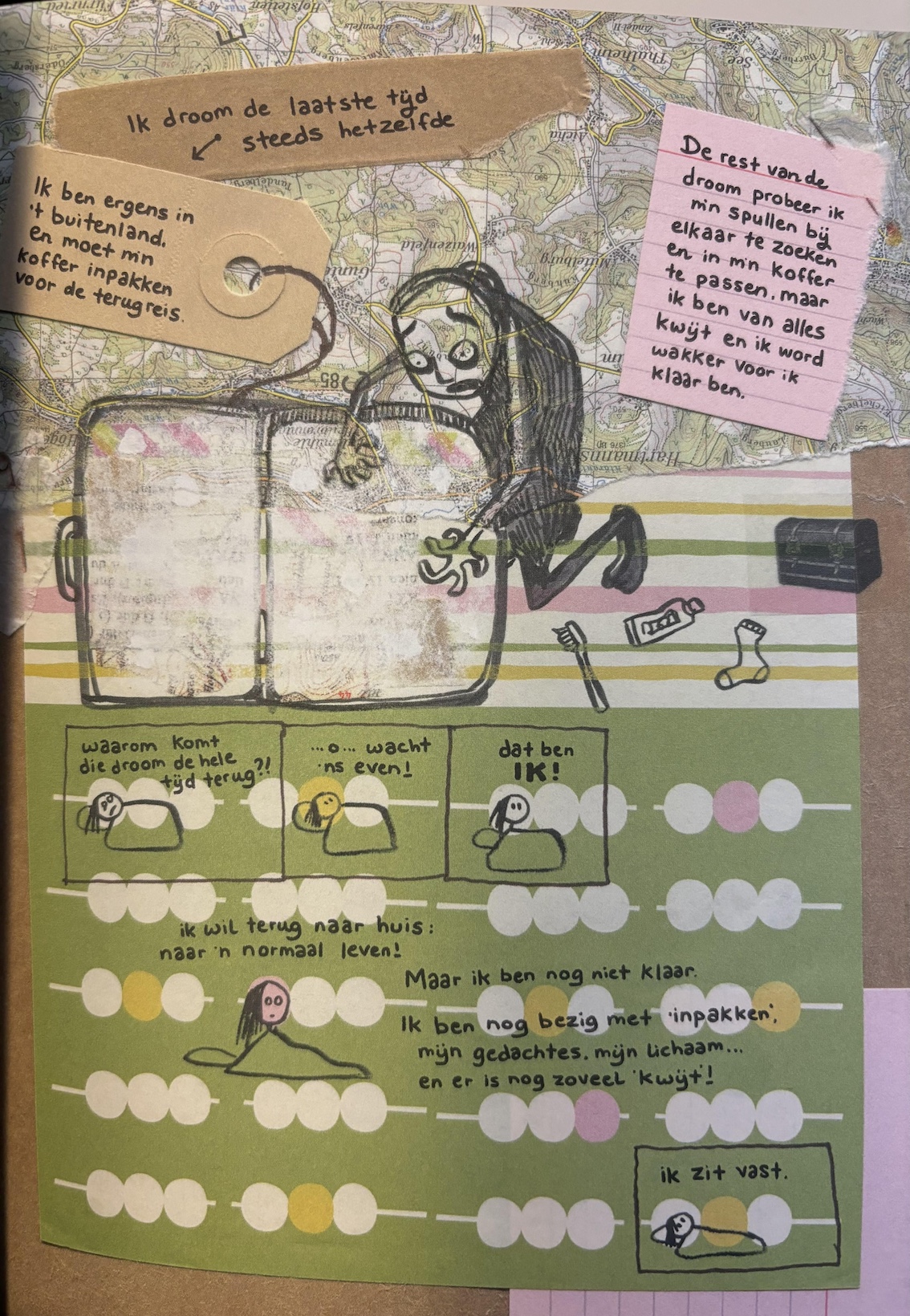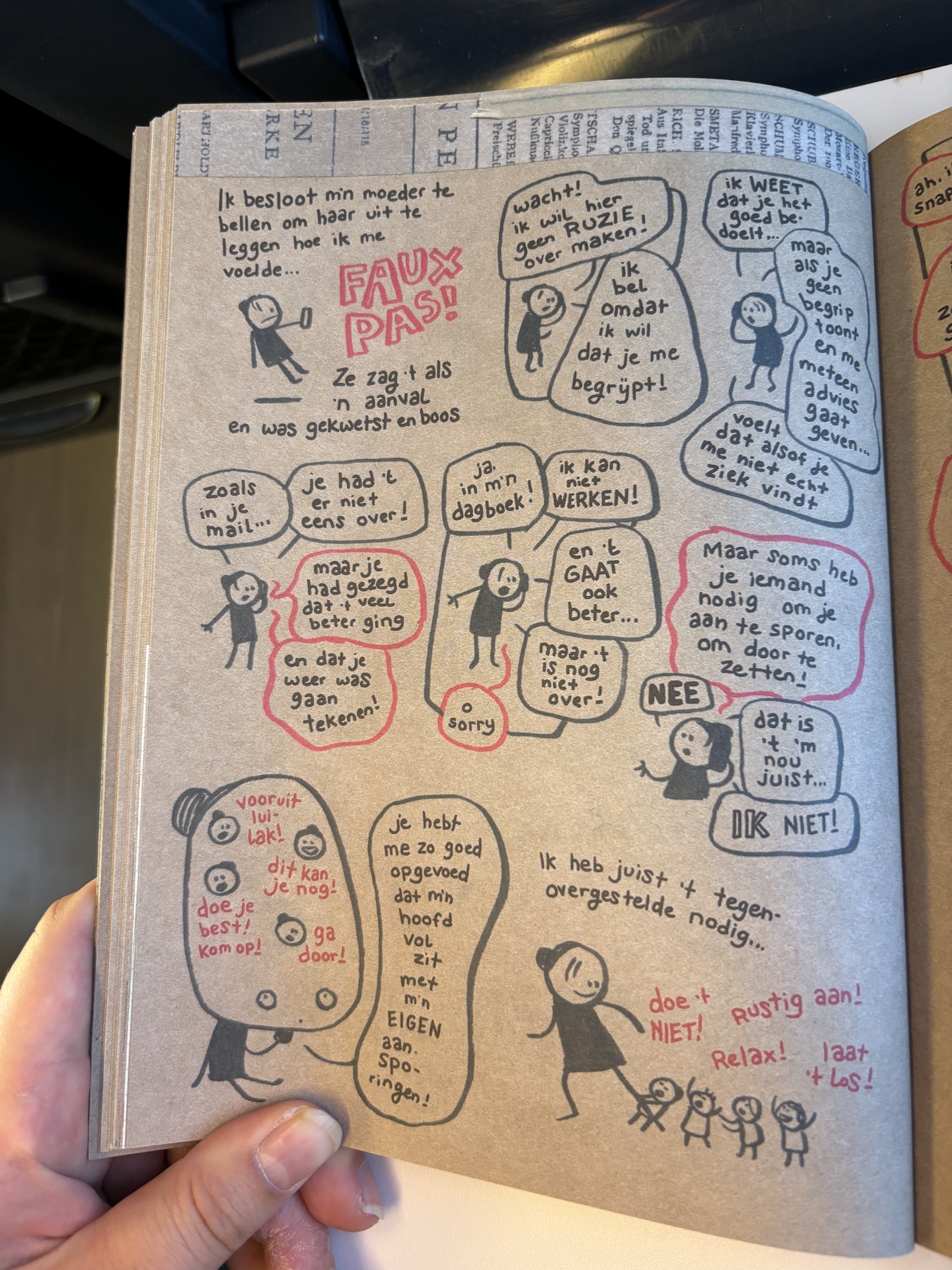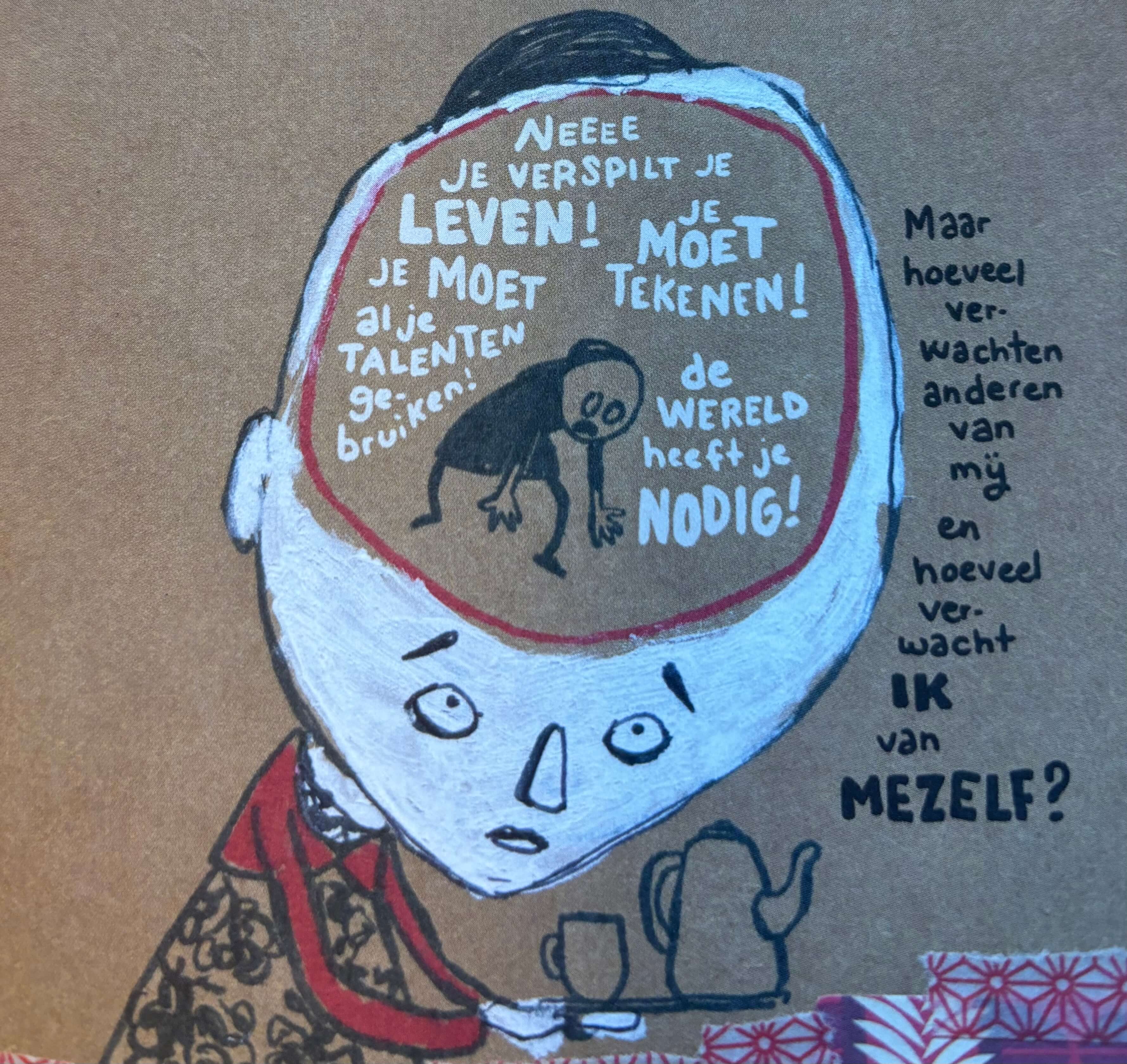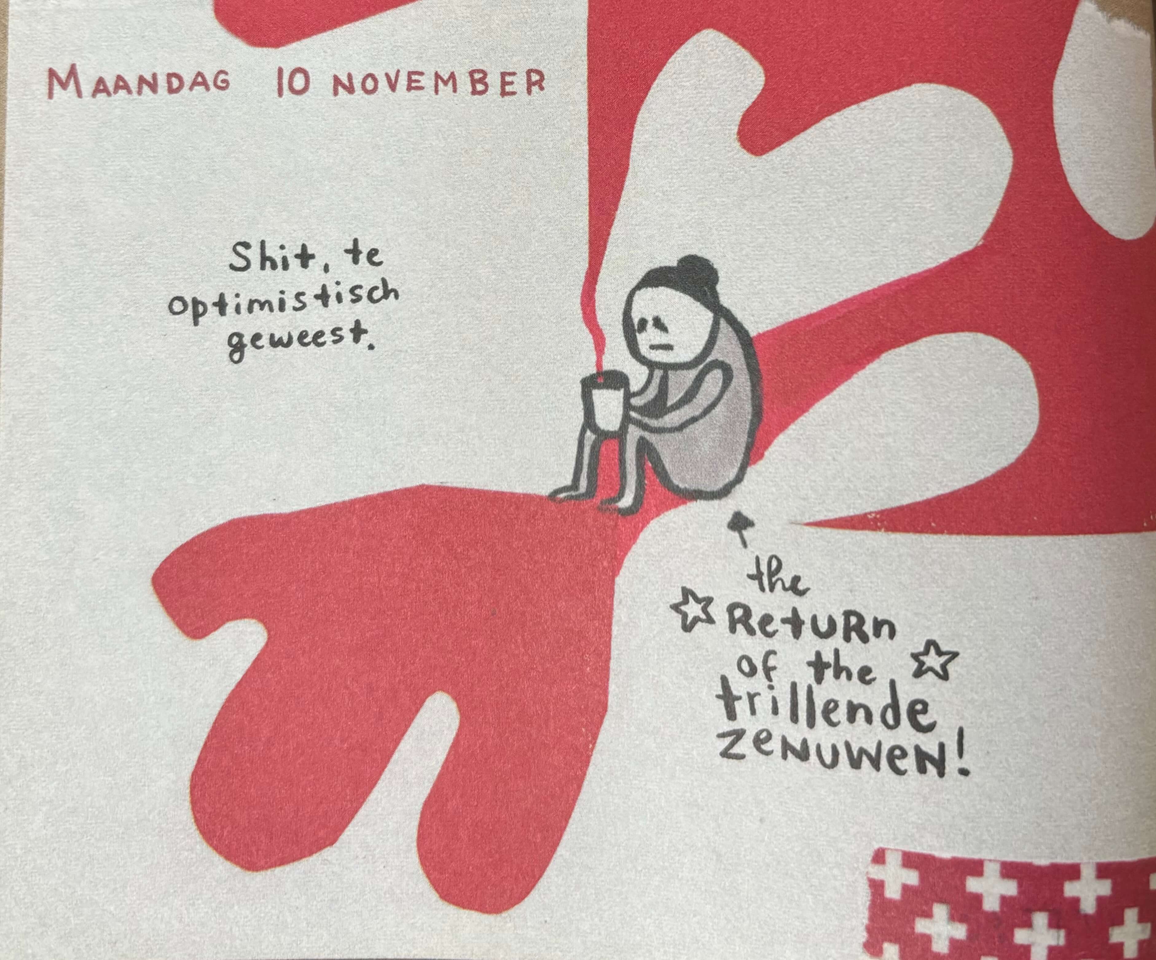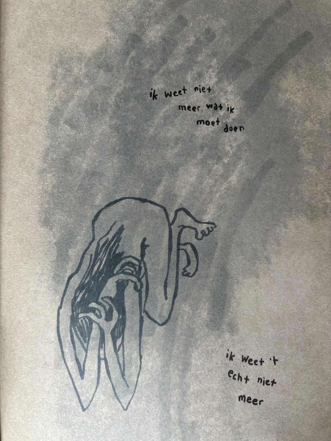 Maaike illustreert hier goed hoe het is om midden in die burn-out te zitten. Ik denk dat het belangrijk is om te laten zien dat niemand vrijwillig zich zo voelt, en dat het ook geen pretje is om een burn-out te hebben. Ik vind het ook mooi hoe Maaike laat zien dat je zelf bewuster raakt van dat je een probleem hebt, en dat dat probleem nog niet is opgelost en dat je niet altijd op dat moment een oplossing er voor hebt. Het is een heel proces.