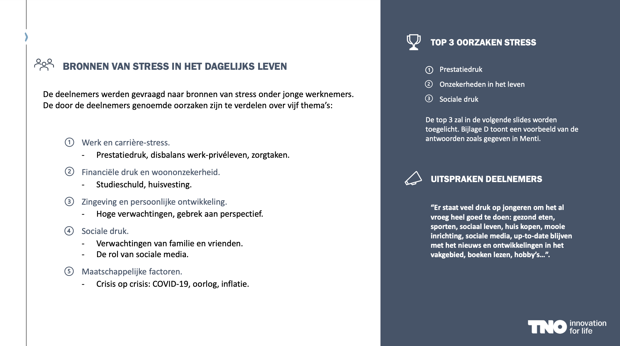 Bronnen van stress die jongeren ervaren in het dagelijks leven: werk en carrière-stress, financiële druk en woononzekerheid, zingeving en persoonlijke ontwikkeling, sociale druk en maatschappelijke factoren.