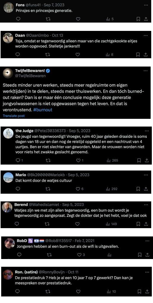 De tweets die je ziet zijn reacties op nieuwsartikelen die zeggen dat burn-out onder jongeren toeneemt en vergelijkbare artikelen. Wat ik merkte is dat bijna alle reacties hieronder negatief waren. Nu gaat het natuurlijk wel om reacties onder een nieuwsartikel op social media, hier reageren vaak dezelfde mensen onder met dezelfde meningen, maar toch vond ik het schrikbarend.