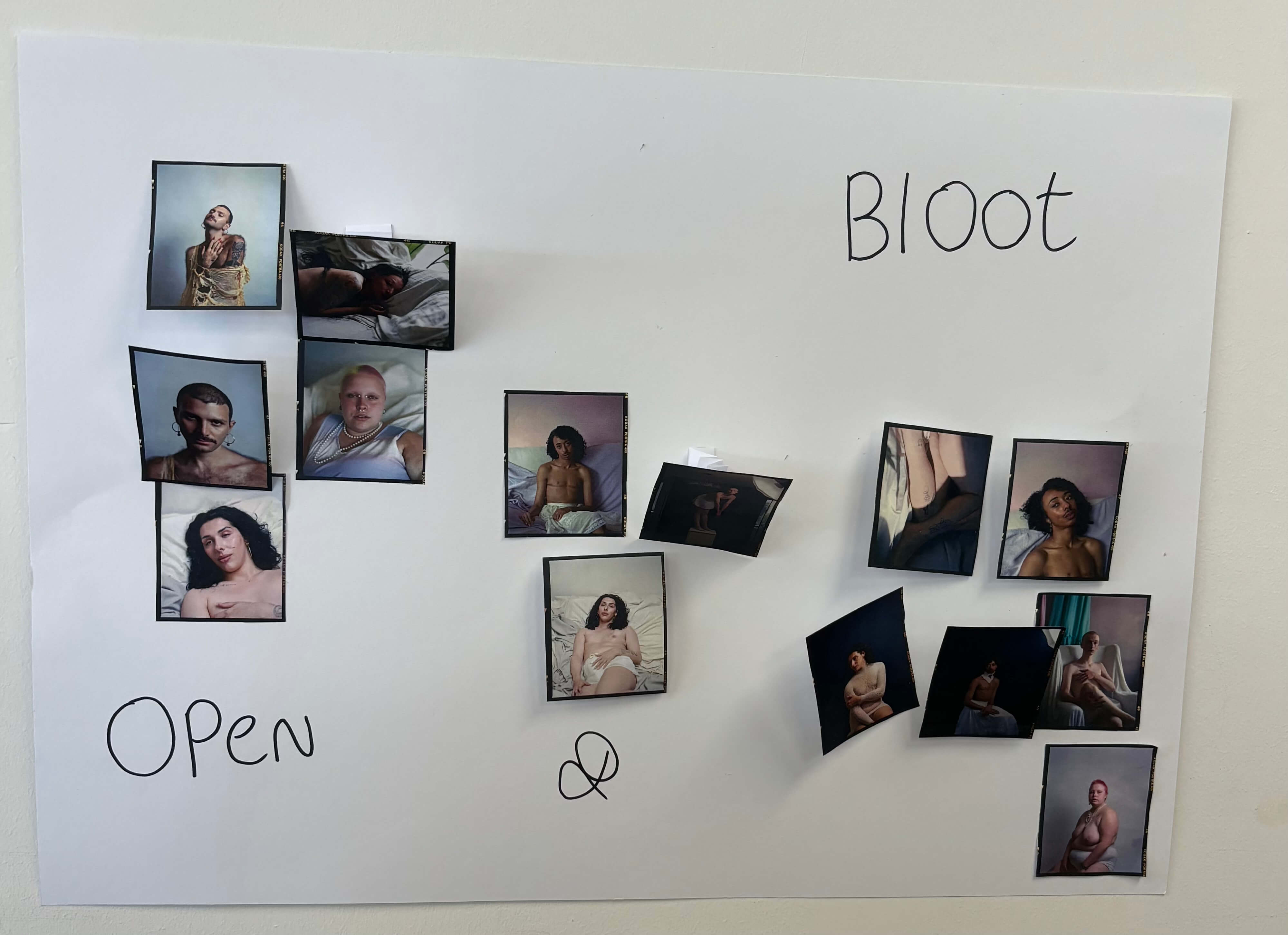 Tijdens die workshop heb ik samen met twee medestudenten Rox’ foto’s neergelegd zoals hier links te zien is. We hebben ze verdeeld in drie categorieën: open, bloot en een combinatie van de twee. Ik vond het heel fijn om een keer dieper in te gaan op het materiaal en wat voor vorm het beste jouw verhaal kan vertellen.
